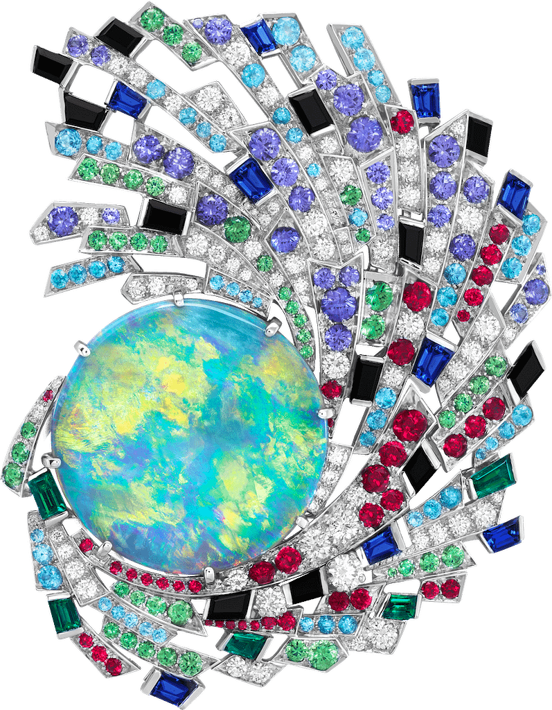 Whatever the origin of its name may be, the opal has a unique beauty and qualities that no other precious or semiprecious stone possesses. Unlike most other gemstones, which are formed with atom-level bonds and are crystalline in structure, opals are composed of tiny silica spheres stacked on top of each other in irregular patterns. The Van Cleef & Arpels Nébuleuse d’Opale clip pictured right is crafted of a 23-carat black opal, emeralds, rubies, colored sapphires, black spinels, tsavorite garnets, green tourmalines and diamonds.